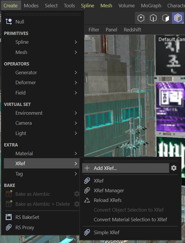 When importing KitBash assets into Cinema for Redshift, the texture nodes need to be edited and given Redshift render tags to work properly. I prepped the textures on all the models for Redshift use, and used those files as XRefs in my scene to have all assets readily available and ready for rendering.
