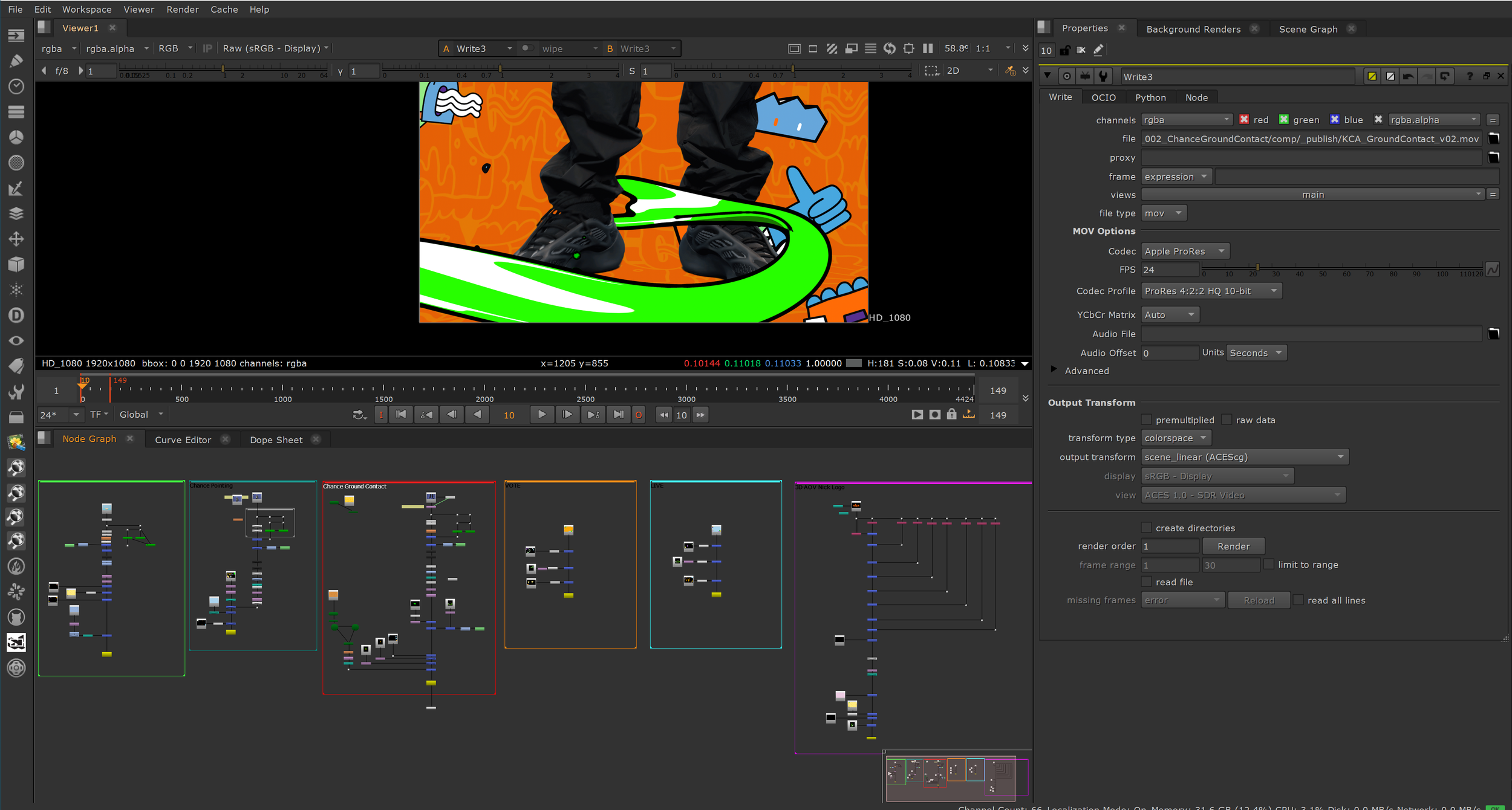 All scenes were divided by backdrop nodes in Nuke X, with the ground contact shot using the 3D layering system in Nuke. My 3D animation of the Nickelodeon logo used AOV render passes.