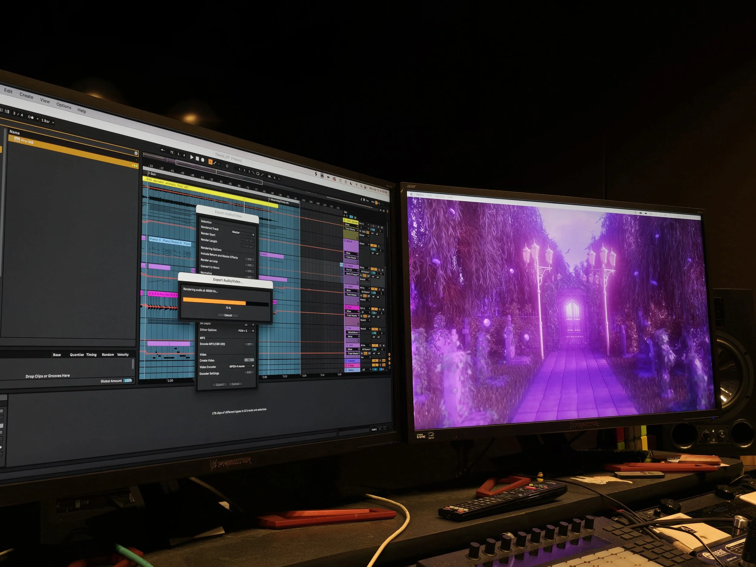 Using After Effects, various textures and videos would be layered over the 3D renders to enhance the atmosphere of the scenes. Many color correcting tools such as curves, levels, and different blending modes were used to give a purple-pink color cast to everything. Bloom is your friend.