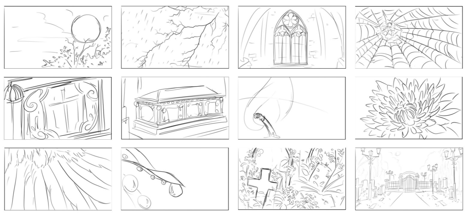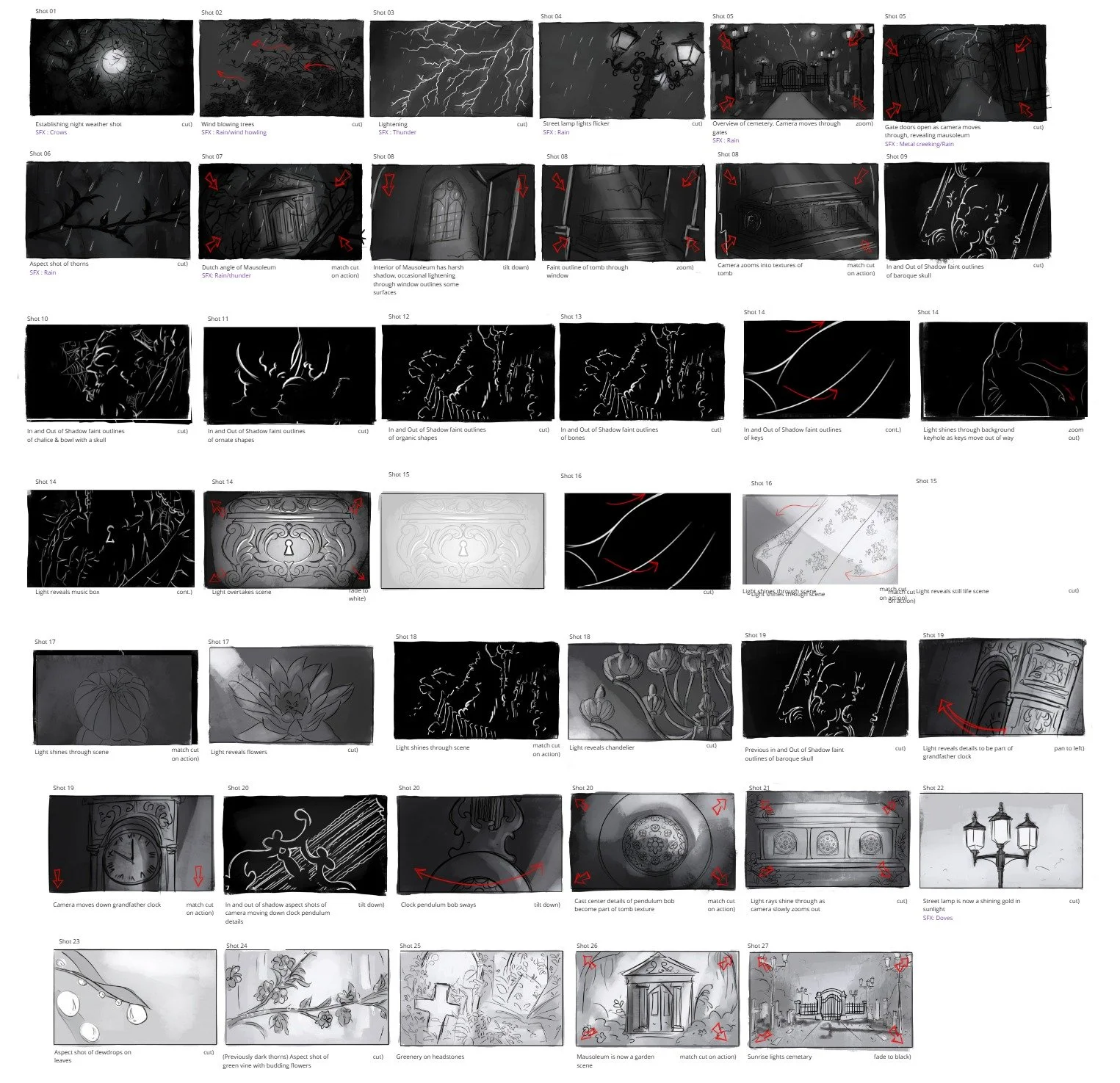 The original storyboard needed more of a narrative. All these aspect shots were creating a spectacle, a cemetery wallpaper. A visual metaphor would be needed to drive the scenario.